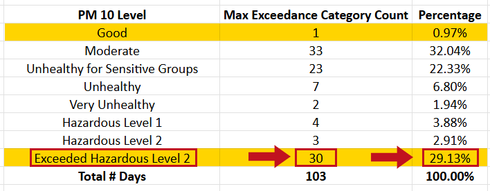 OUT OF 103 DAYS OF PM10 DATA, THEIR MAX EMISSIONS EXCEEDED THE EPA'S HIGHEST TRANCHE TWENTY NINE PERCENT OF THE TIME…. THEY ONLY HAD ONE “GOOD” DAY.