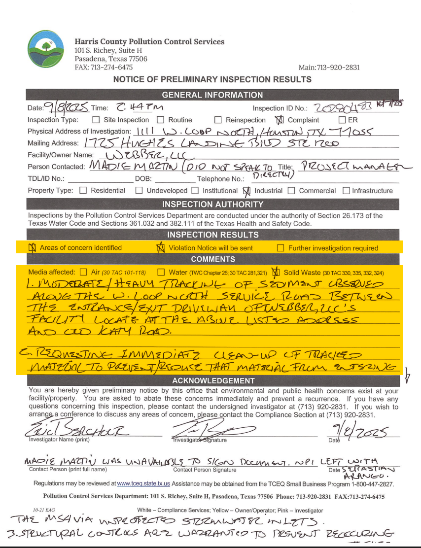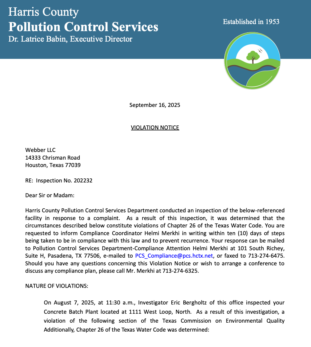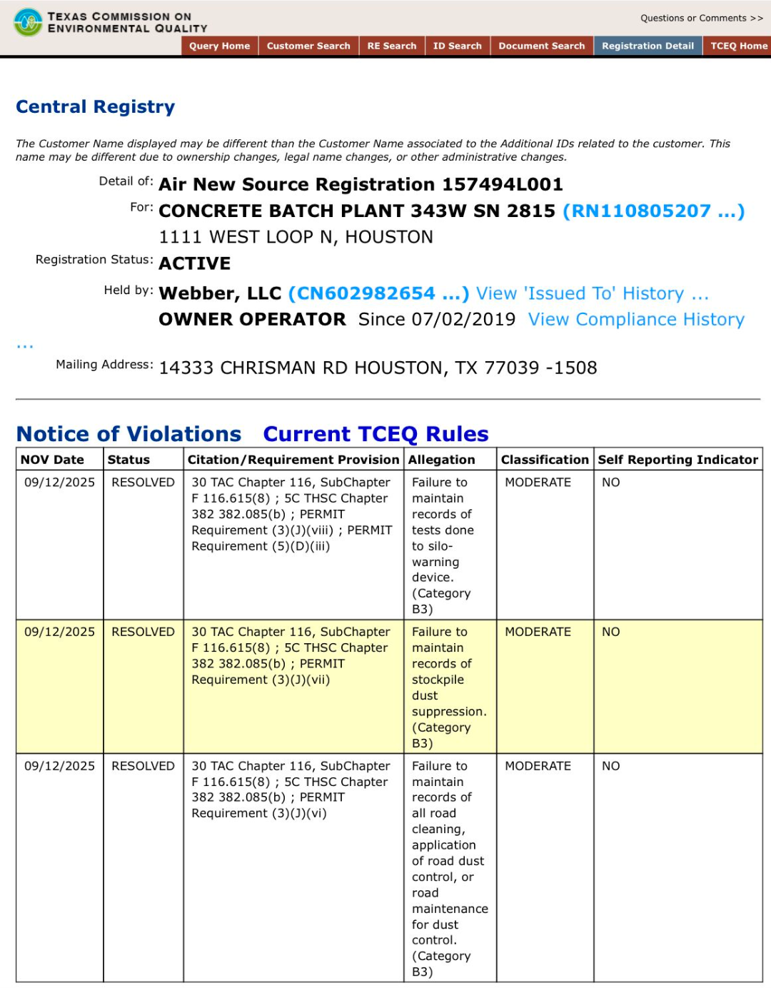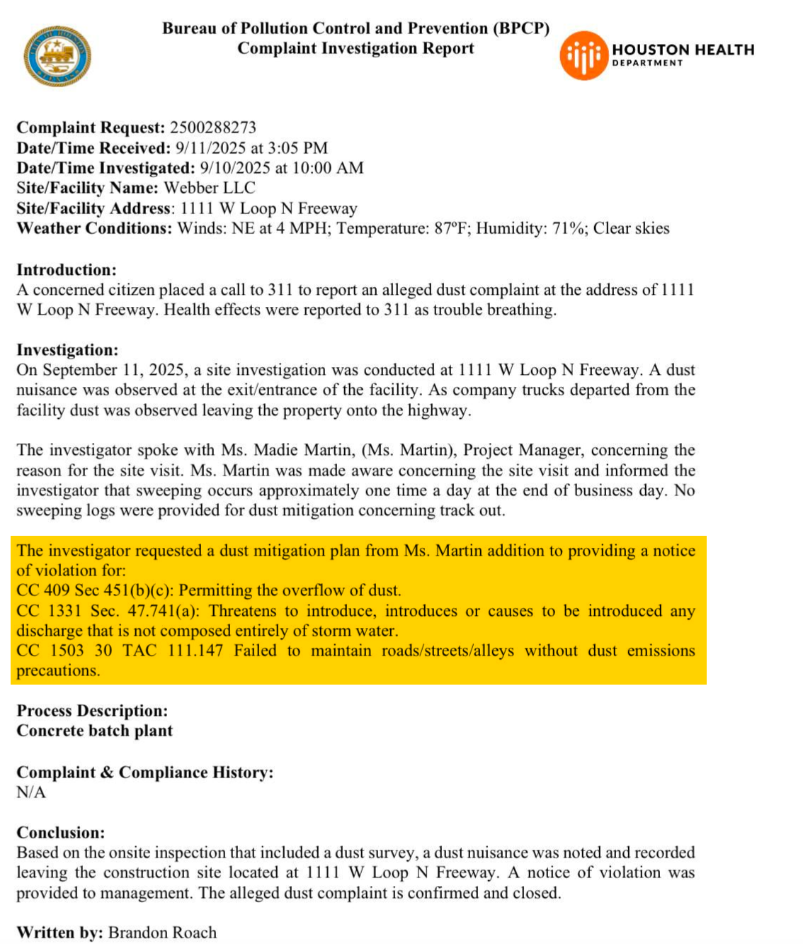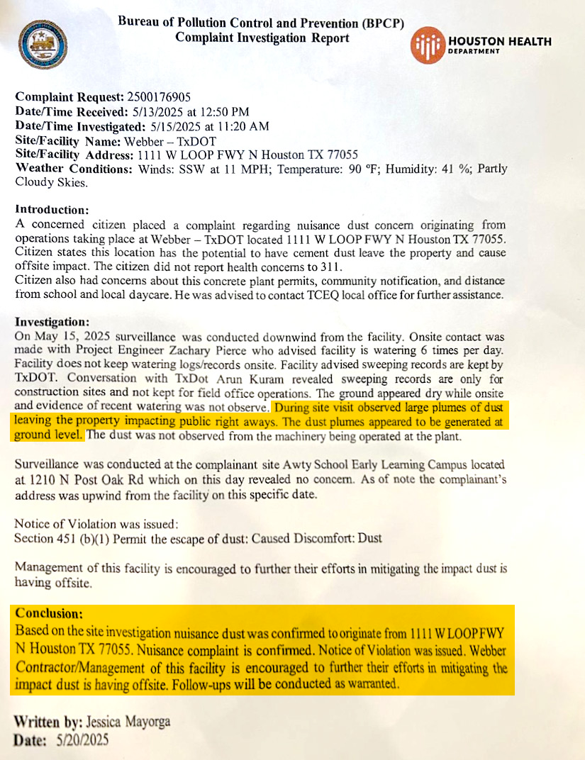 - 2 dust citations from the City of Houston, where investigators witnessed visible plumes of dust escaping the plant.